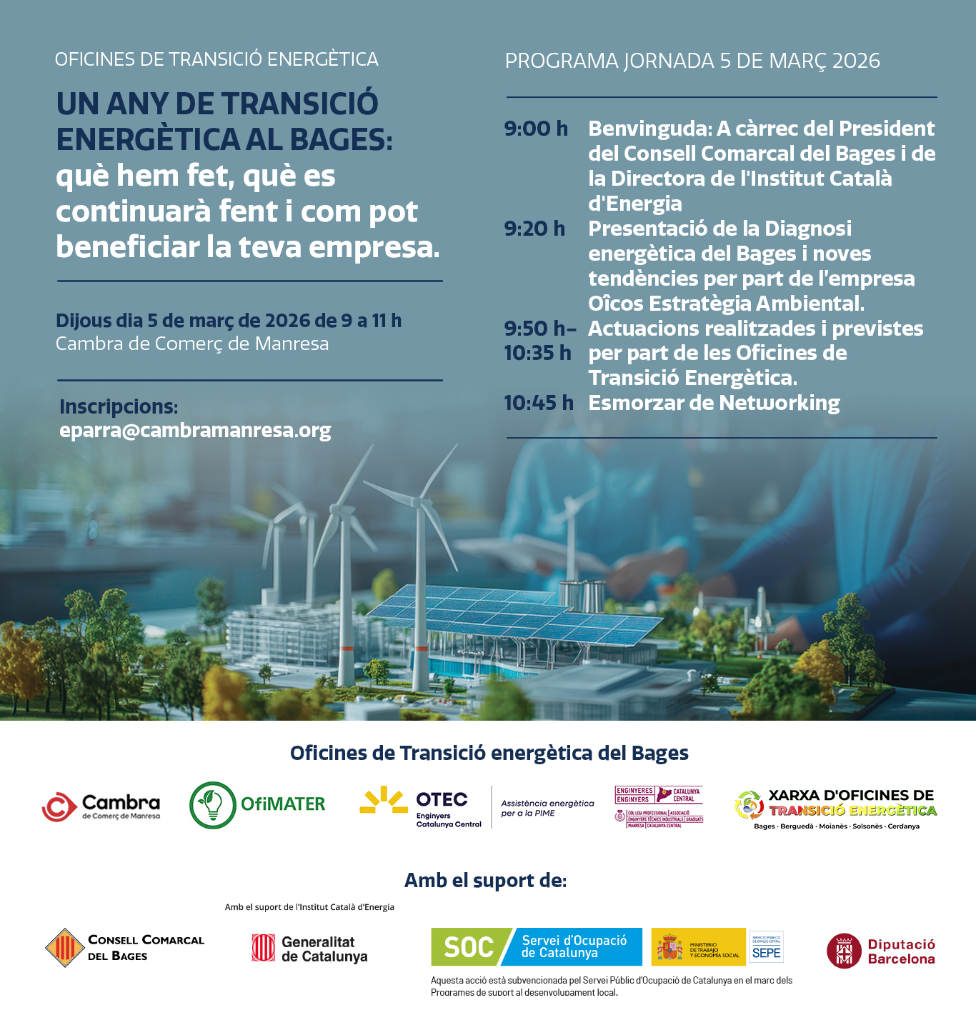 Jornada organitzada conjuntament per les OTEs del Bages, adreçada a les PIMEs de la comarca, amb l’objectiu de presentar el balanç de la feina realitzada fins ara: principals tasques desenvolupades, casos d’èxit i línies de treball futures. La jornada també servirà per exposar una diagnosi energètica del Bages, així com per donar a conèixer les principals tendències i novetats en l’àmbit energètic, entre altres aspectes d’interès per al teixit empresarial del territori.