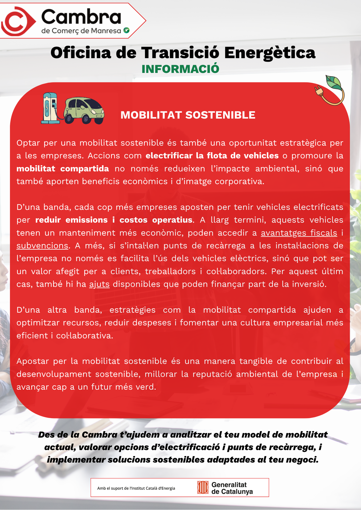 Des de la Cambra t’ajudem a analitzar el teu model de mobilitat actual, valorar opcions d’electrificació i punts de recàrrega, i implementar solucions sostenibles adaptades al teu negoci.