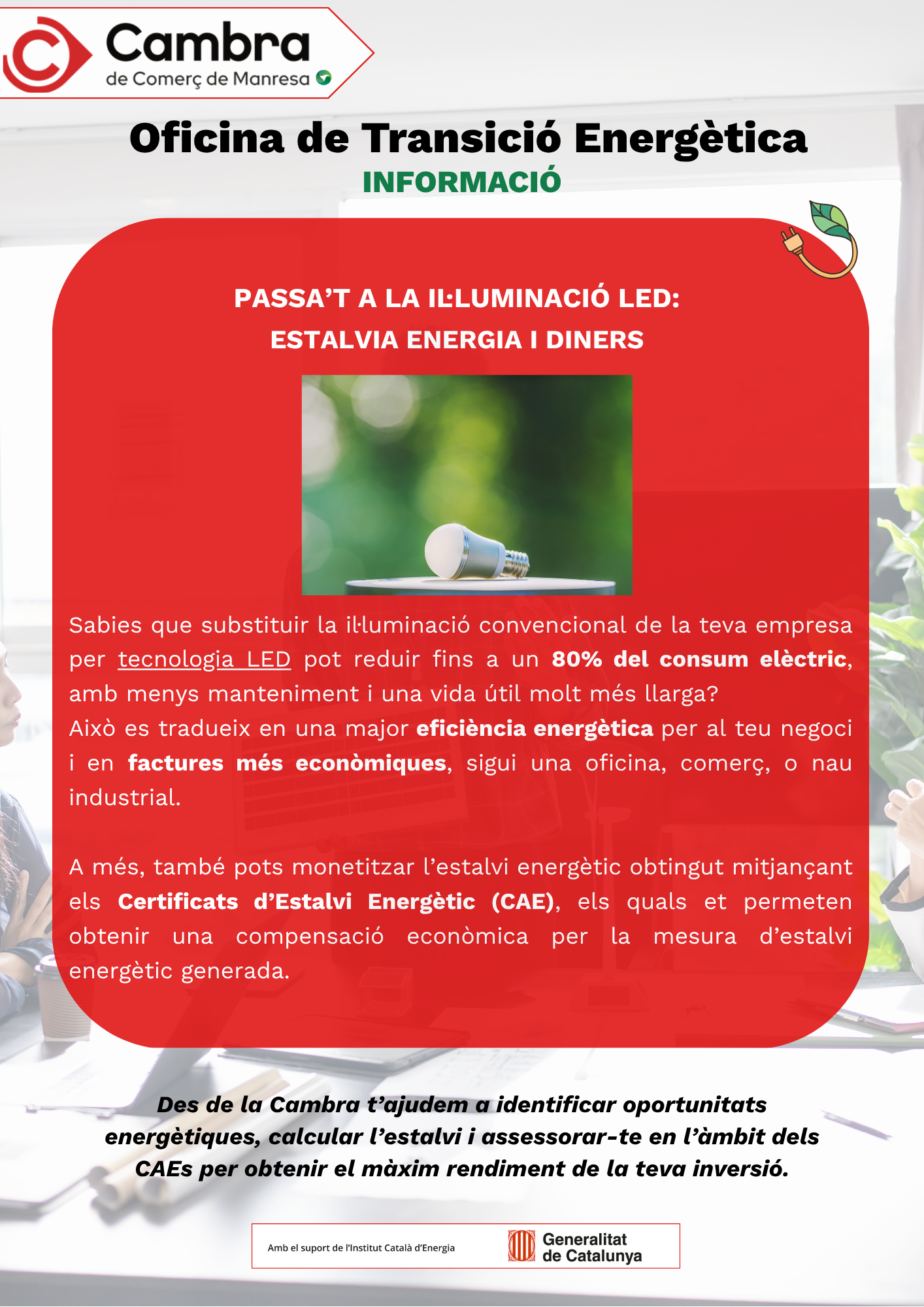 Des de la Cambra, t’ajudem a identificar oportunitats energètiques, calcular l’estalvi i assessorar-te en l’àmbit dels CAE’s per obtenir el màxim rendiment de la teva inversió.